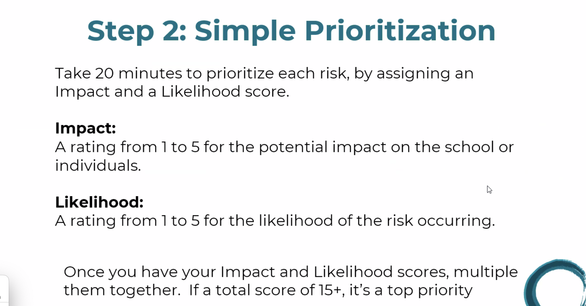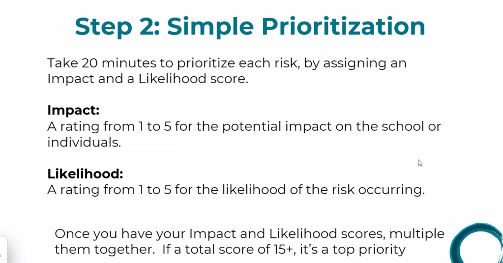 Kristi then broke down a 90-minute Risk Management Starter. Step one is to do a 30-minute brain storm on the prompts above. The goal of step one is to come up with 10 to 15 risks.
