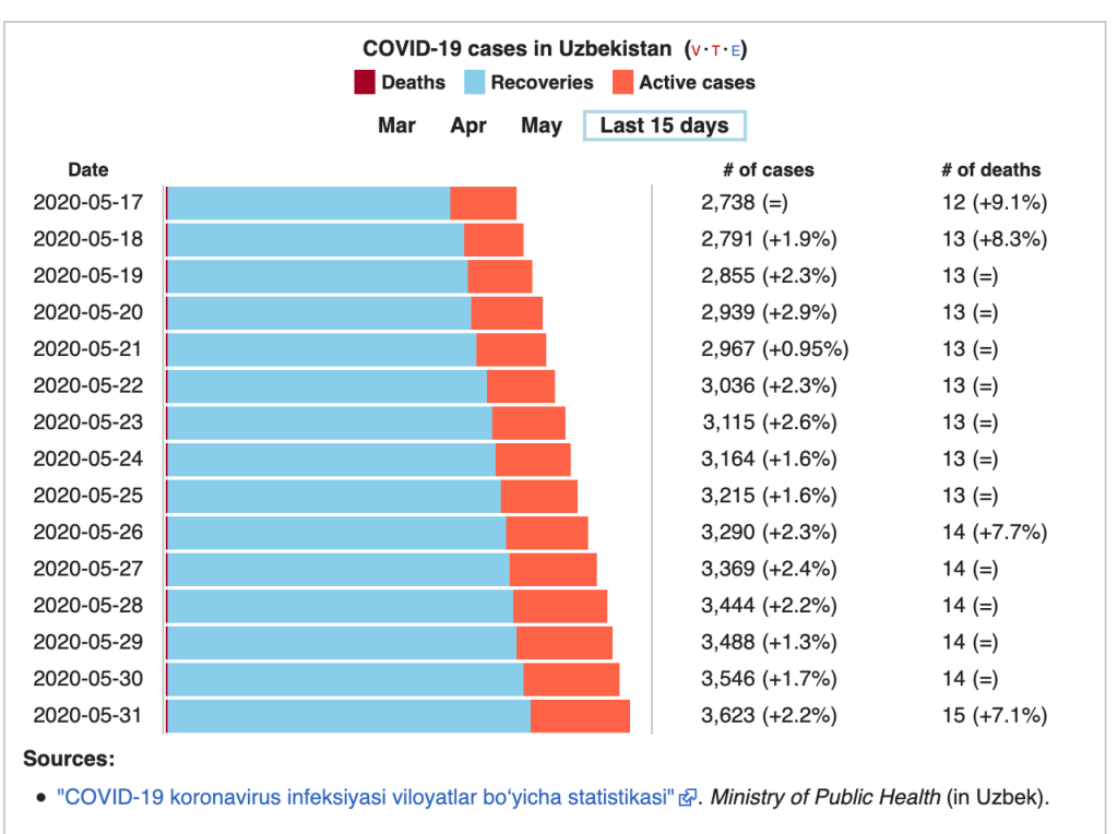 I wonder what the number of people with coronavirus at any one time in Tashkent? According to the statistics from the Ministry of Health and World Health Organization office in Tashkent, there are currently 878 active cases in Uzbekistan. There seems to be a steady number of cases daily, around 50 per day. Most of the cases are in quarantine and few from the general population. However, there is always the question of the accuracy of the data and the number of people tested (approximately 370,000 as reported on Wikipedia).