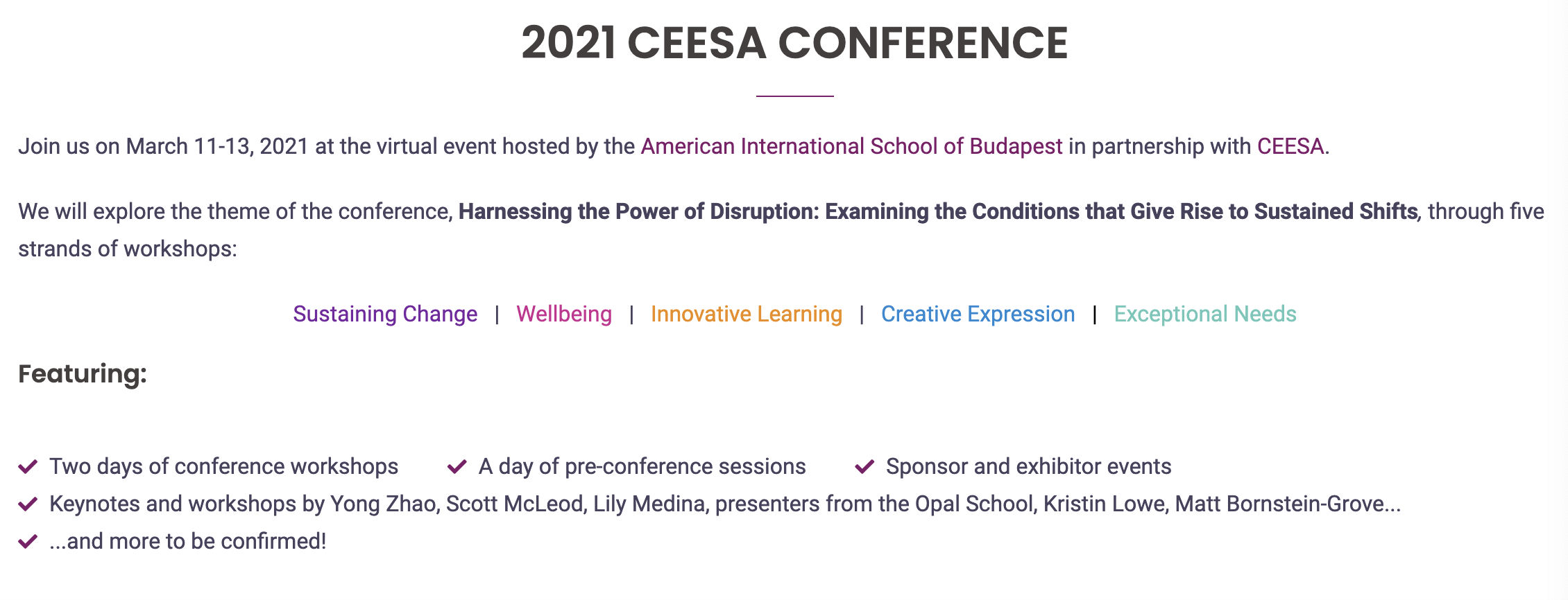 Teacher professional development around the world is still mostly online and in our Central & Eastern Europe Schools Association region is not an exception. Below is the announcement of the 2021 CEESA Virtual Conference that is hosted by the American International School of Budapest from March 11-13, 2021. Harnessing the Power of Disruption is the theme. The pandemic certainly has disrupted everything that schools do. This major disruption has given all of us carte blanche to remake teaching and learning.