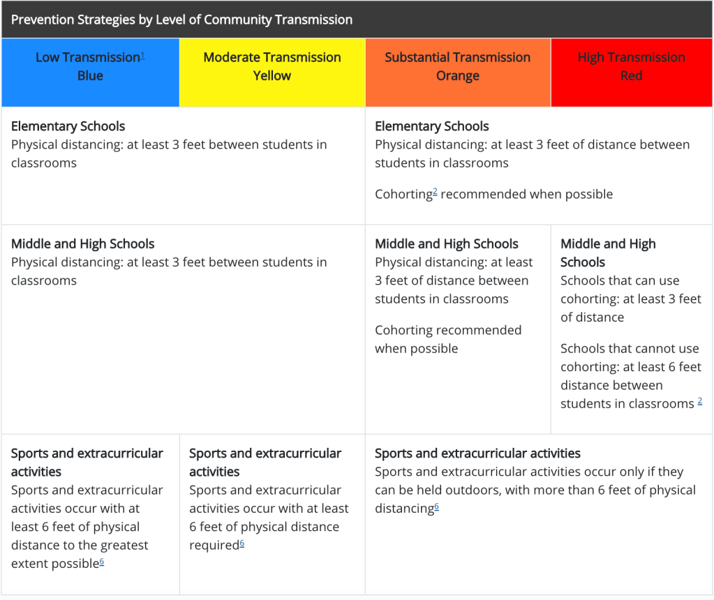 - More resources for schools provided by the CDC can be found here. The CDC also collected research on transmissions in school here.