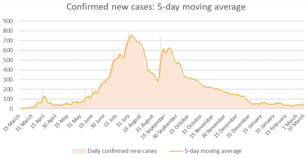 We are currently debating on loosening our protocols in phases. One of the areas is mixing cohorts in sports and extracurricular activities. We are currently experiencing a slight rise in cases and this has delayed any actions as we wait and see what the trends will be over the next month. Below is the confirmed new cases averages from WHO Uzbekistan office. We are hoping that the latest increases in cases does not go to the heights of July and October.