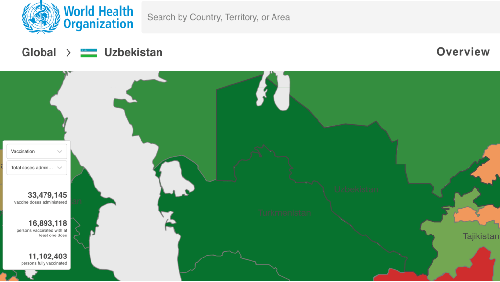 According to the WHO, over 33 million vaccine doses have been administered here in Uzbekistan and over 16 million people out of a total population of 34 million have at least one dose. As with many countries, getting accurate data is difficult and all COVID statistics in Central Asia are vastly under reported. I think the vaccination data is more accurate than cases, hospitalizations and deaths data because of the WHO’s COVAX program and its network of public health officials working with local Sanitary Epidemilogical Stations.