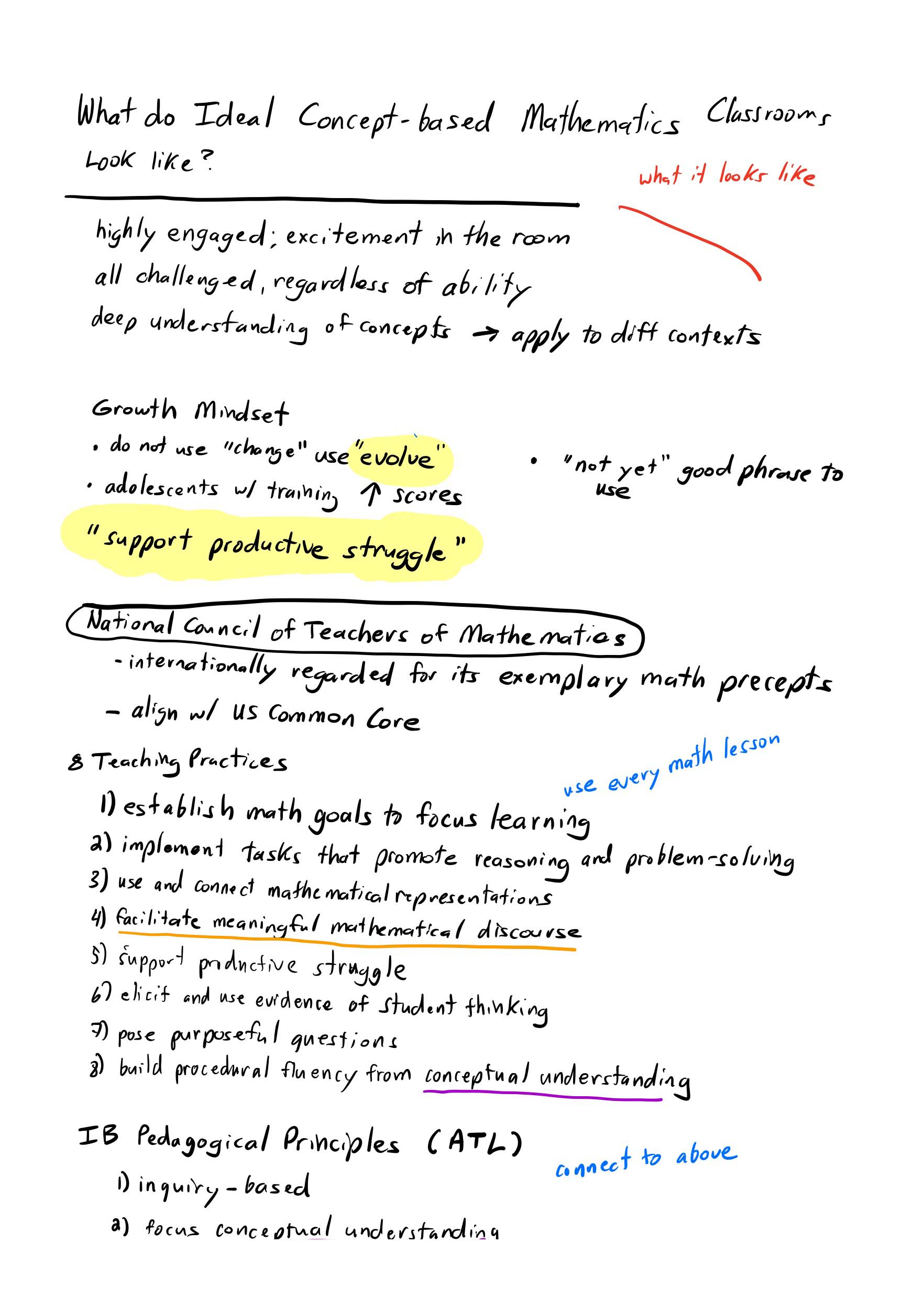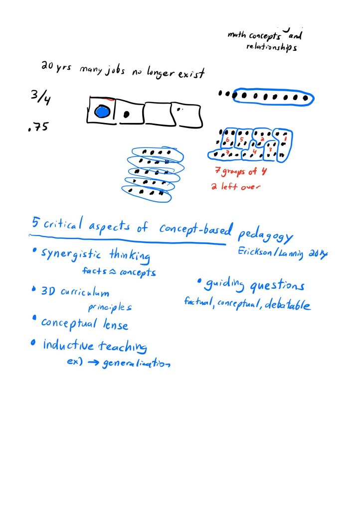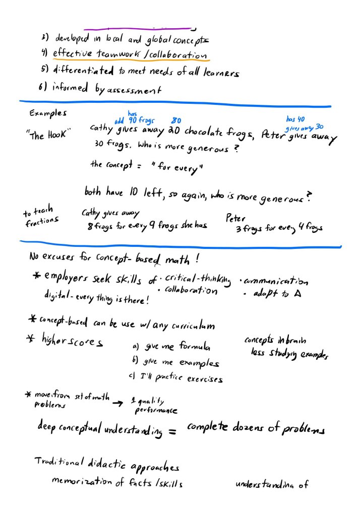 In the last chapter of her book, “What do Ideal Concept-based Mathematics Classrooms Look Like”, Wathall lays out the vision and fundamentals. I am posting my notes at the bottom of this post. The idea of supporting productive struggle and instilling in math students a growth mindset underpins the concept-based classroom. I also like how she ties what employers are looking for; critical thinking, collaboration, communication, and adapting to change to the skills math students should be learning.