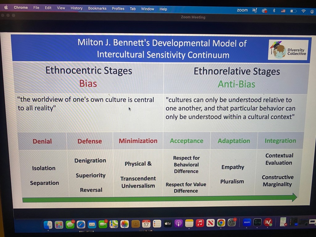 I participated in an Implicit Bias workshop offered by Alan Phan and Aparna Sundaram from the Central and Eastern European Schools Association (CEESA) Diversity Collective this evening. The workshop was aimed at school leaders and recruiting practices. Heads of Schools have a lot of power in selecting faculty and staff. Implicit biases are unconscious attitudes or stereotypes that humans hold that affect our actions, decisions and understanding. These can be positive or negative. They are personal and can be affected by media, experiences, friends family, and colleagues. Alan and Aparna went through the research literature on the subject. One interesting slide was Milton J. Bennett’s Development Model of Intercultural Sensitivity Continuum (below). Alan said most international school leaders are in the Acceptance Stage and the goal of training like this is to move people into the Adaptation and Integration stages. I would like to think my 30 years of living outside my home culture of the USA and working in a field that is predominately women and getting to know intimately families from all over the world, has helped me overcome my biases.