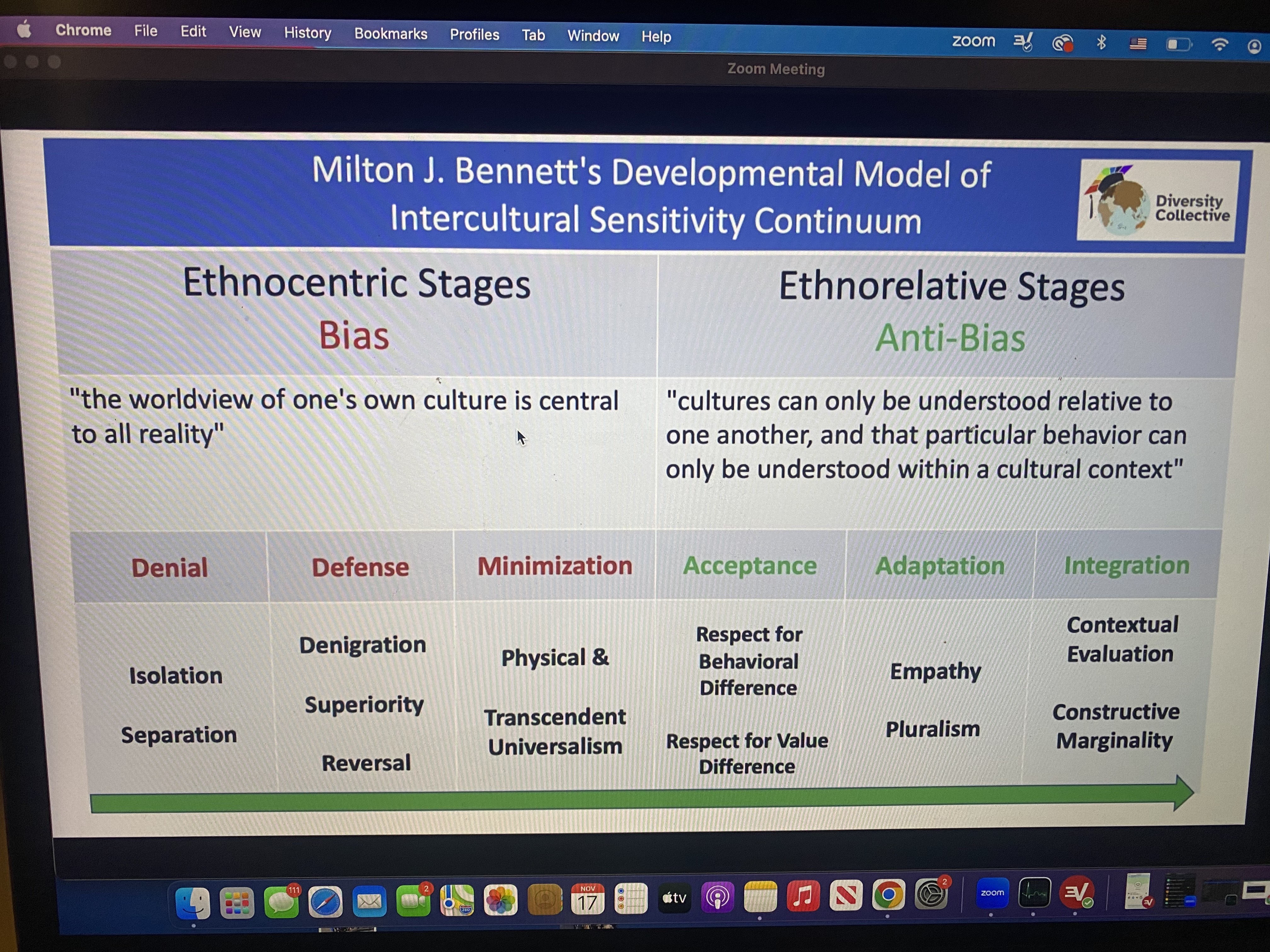 I participated in an Implicit Bias workshop offered by Alan Phan and Aparna Sundaram from the Central and Eastern European Schools Association (CEESA) Diversity Collective this evening. The workshop was aimed at school leaders and recruiting practices. Heads of Schools have a lot of power in selecting faculty and staff. Implicit biases are unconscious attitudes or stereotypes that humans hold that affect our actions, decisions and understanding. These can be positive or negative. They are personal and can be affected by media, experiences, friends family, and colleagues. Alan and Aparna went through the research literature on the subject. One interesting slide was Milton J. Bennett’s Development Model of Intercultural Sensitivity Continuum (below). Alan said most international school leaders are in the Acceptance Stage and the goal of training like this is to move people into the Adaptation and Integration stages. I would like to think my 30 years of living outside my home culture of the USA and working in a field that is predominately women and getting to know intimately families from all over the world, has helped me overcome my biases.