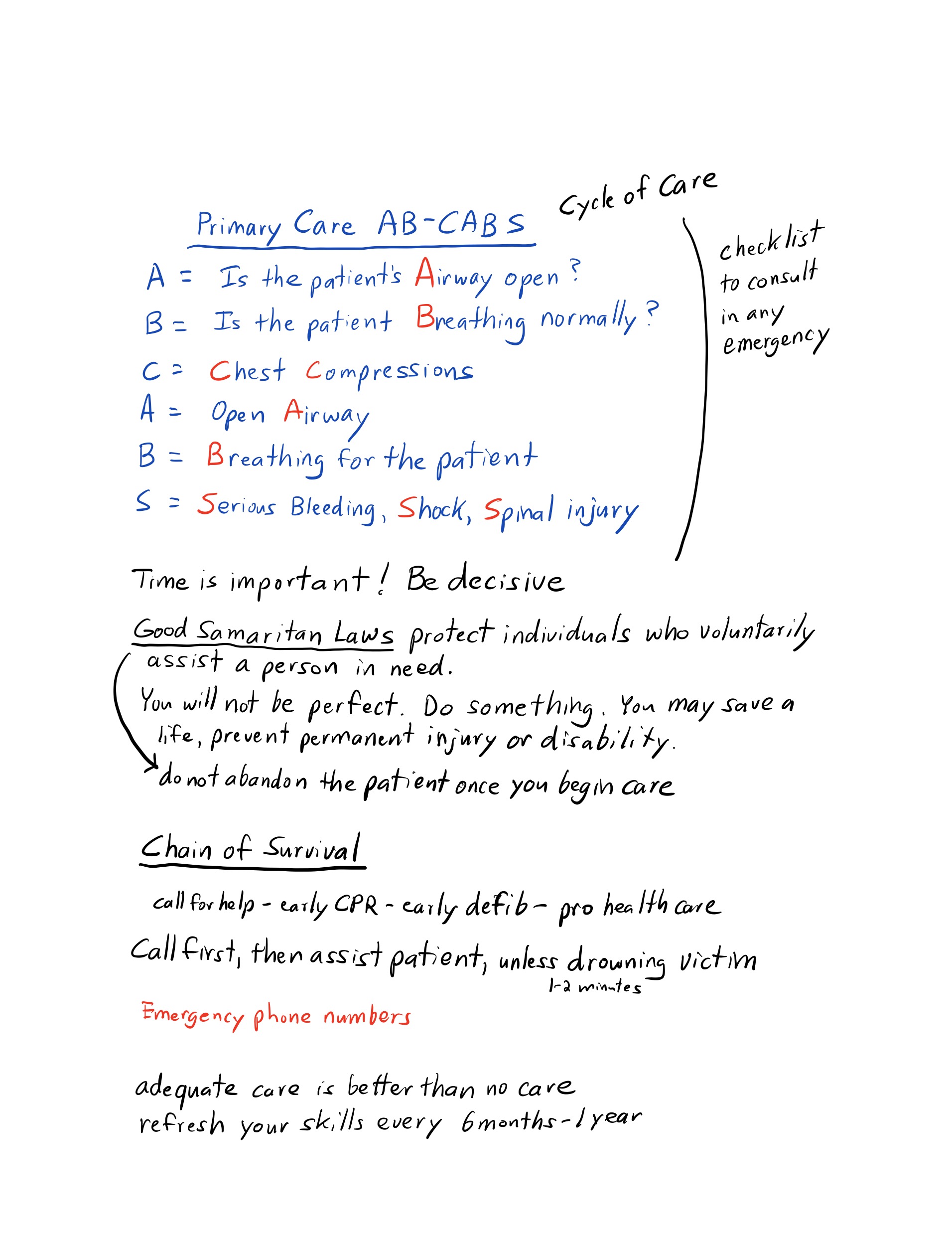 My big takeaway from the sessions is we need to better identify where the First Aid Stations are on campus, especially the first aid stations with AED (Automatic External Defibrillator). It would also be good to have laminated emergency phone numbers placed in all medical kits and ask employees to put the numbers in their phones. Below are my notes from the online portion of the training that I took with my iPad and shared with my computer.