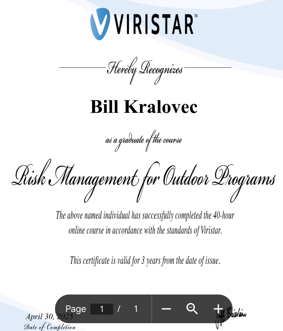 With the program growing, I am focusing on keeping our students and faculty safe. Viristar is a company that provides expert services to outdoor, adventure, and experiential programs. In April, I completed the company’s 40-hour course, Risk Management for Outdoor Programs. The course is framing my thinking around risk management. My big takeaways from the course are as follows: