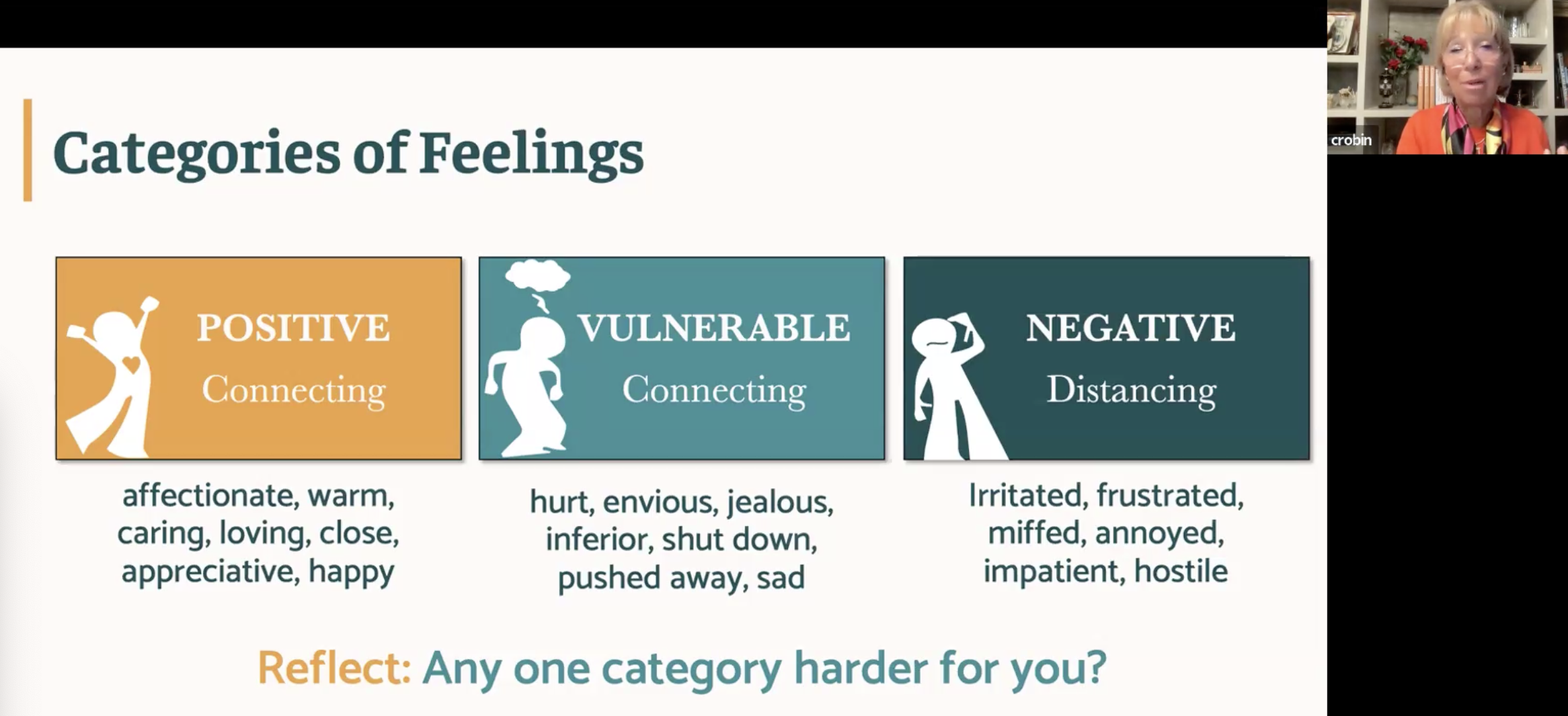 Robin’s advice is when giving feedback is to focus on #2 (behavior) and #3 (your feelings) NOT on your guess of the intent. Do not say “I feel that you…”, instead, say “When you (behavior #2), I feel (impact #3). STAY ON YOUR SIDE OF THE NET. She also shared the framework for categorizing feelings below. Often when colleagues are demonstrating Negative feelings that distance relationships, they are masking Vulnerable feelings such as fear or hurt. She also used the word “pinches” to describe those little things that people do that annoy you. It is important to address these before they grow into something larger.