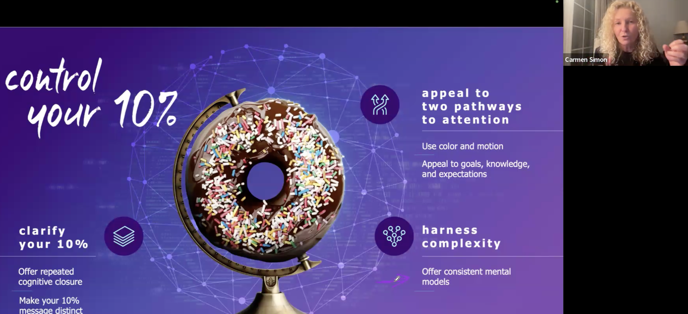 The final workshop I liked was by cognitive neuroscientist Carmen Simon “The Neuroscience of Memorable Content”. She reminded me that audiences forget 90% of what you present within 48 hours. What do you want your audience to remember 48 hours and beyond? CLARIFY YOUR 10%. My takeaways from her was to not be afraid of Repetition. It is OK to repeat your main point in distinct ways several times throughout your presentation. Her other message was the control the focus while “harnessing complexity”. The audience will get board from too simple of a presentation, the human brain likes making sense of complexity. Keep your 10% main message simple and have a large volume, diversity and interdependent concepts/things in your presentation.