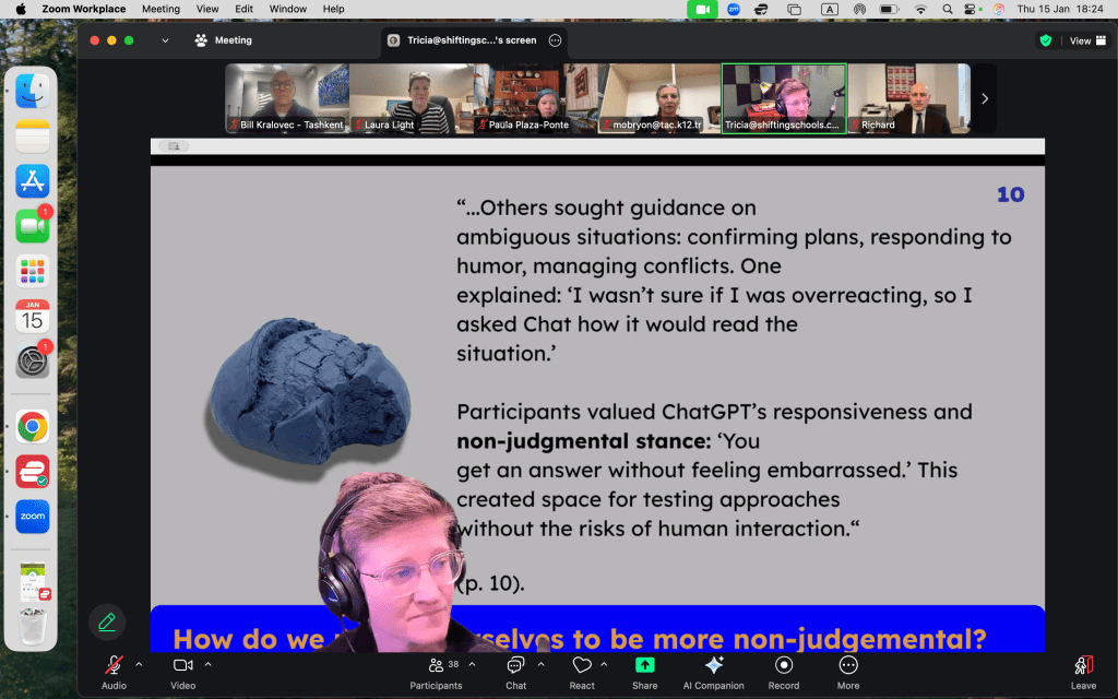 My big takeaway from the session is that a critical mass of people in schools are using AI companions rather than tools. I need to learn how to shape personalized AI Bots, as this is the next stage in education. Schools need to move from being worried about students using AI to “cheat” on assessments to teaching students to enhance their learning through personalized AI companions. The other idea that resonated with me is that people like using AI as tutors because they are non-judgmental. Asking a question for a student to an AI Large Language Model is much easier than asking a question to a teacher in a classroom full of peers. All school leaders should think about being more non-judgmental in our interactions with others.