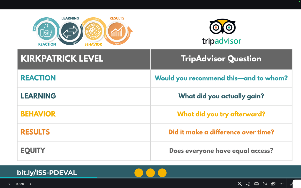 One of Dana’s key messages was the idea of equity in professional development. Are teacher assistants and local hires able to access the PD? She adds the evaluative lens of Equity to the Kirkpatrick Model. Dr. Watts Speck also engagingly compared the Kirkpatrick Model to a TripAdvisor Review.